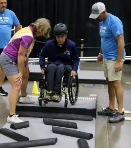 Human Engineering Research Laboratories (HERL) founder and wheelchair athlete Rory Cooper demonstrates his newly designed slalom course during the 2025 NVWG. (Photo by Christopher Di Virgilio.)