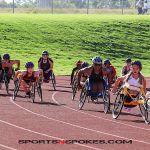 One of many 100m heats starts for a group of athletes during the 2022 Move United Junior Nationals in Westminster, Colo. (Photo by Christopher Di Virgilio).